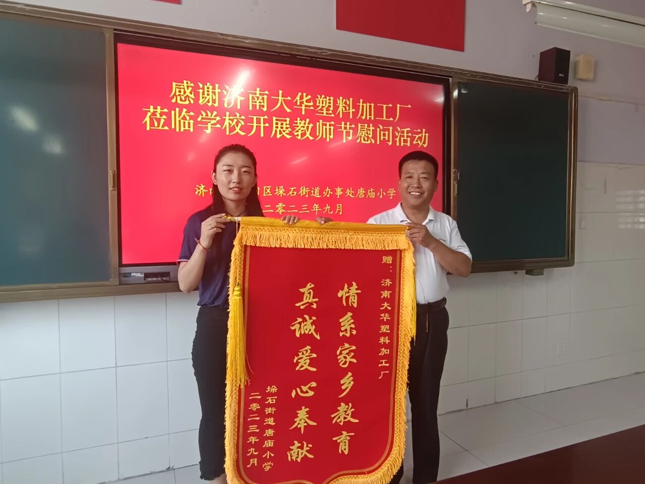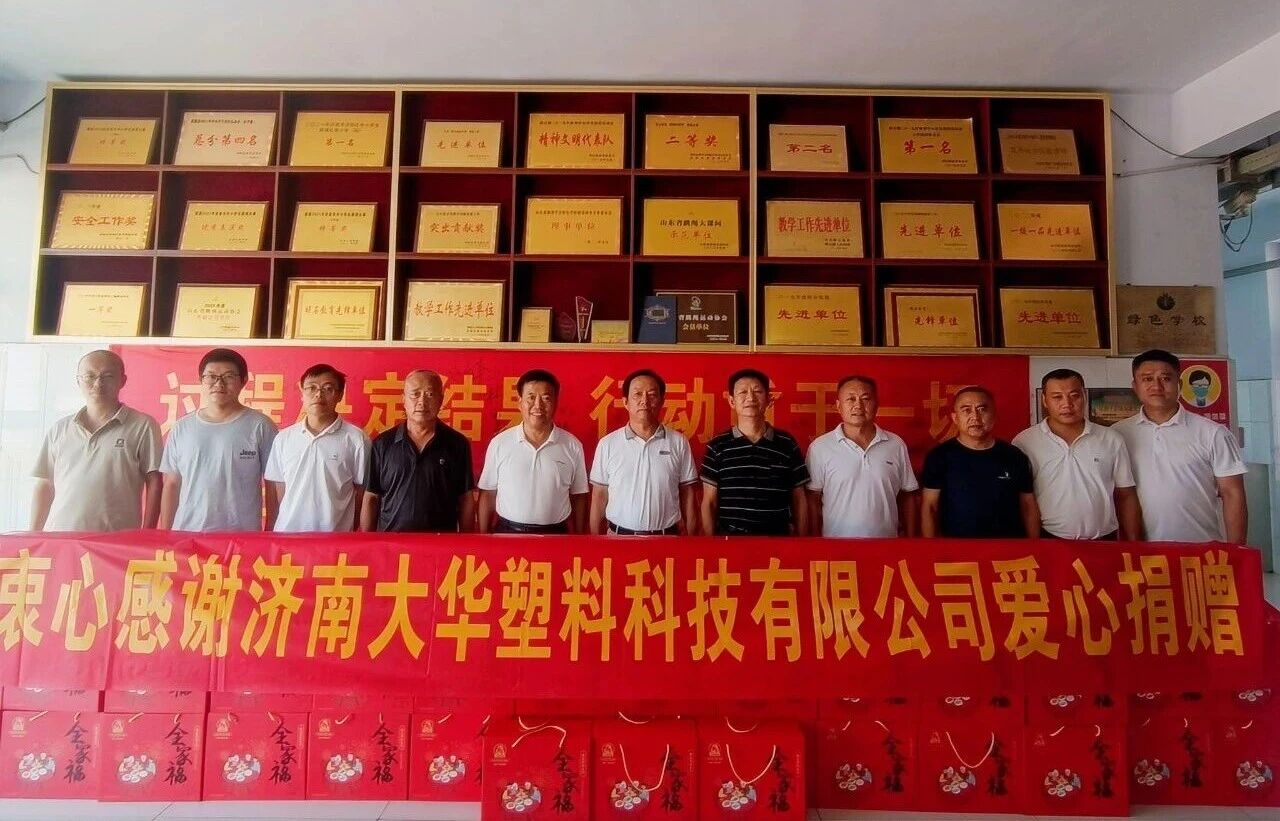尊师重教,情暖校园。在这美好的季节,值此第41个教师节到来之际,济南大华塑料科技有限公司怀着对教育事业满满的关爱和支持,连续三年走进济阳区垛石街道唐庙小学,为全校教师送来了价值一万余元的慰问品,向全体老师致以节日的慰问和美好祝福!